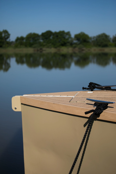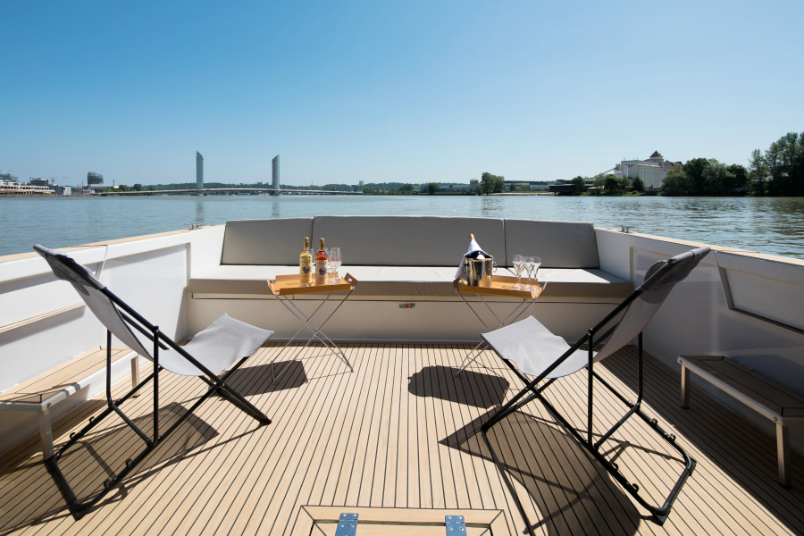 Esprit Garonne dispose donc d’un pont arrière ouvert qui permet d’accueillir la partie apéritive, d’une salle de repas de 12 personnes offrant une vue panoramique, d’une cuisine professionnelle équipée pour produire les repas à bord, d’un poste de pilotage et d’un pont avant ouvert pour profiter pleinement de la vue sur le fleuve.